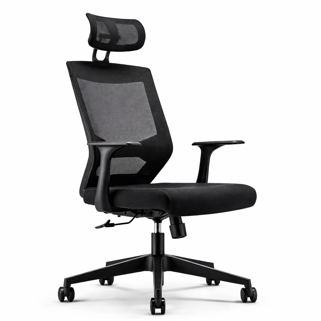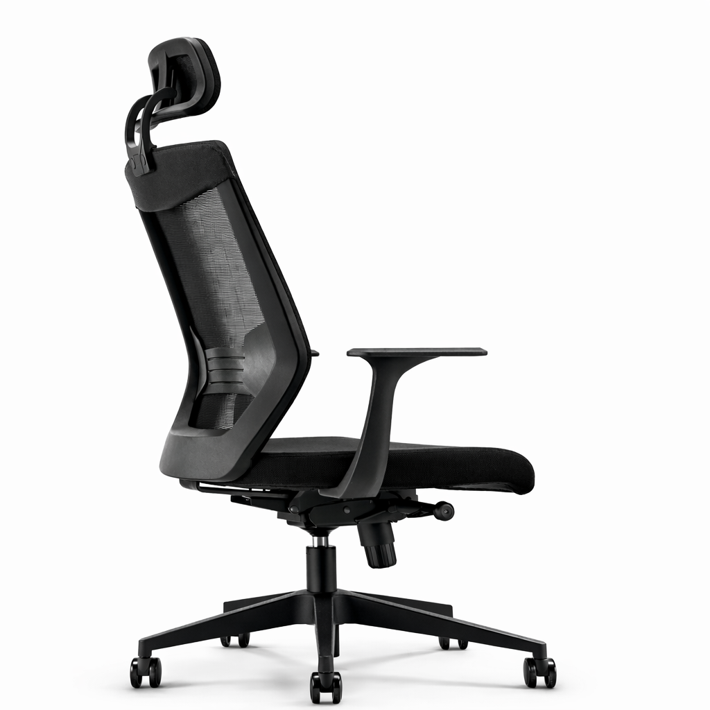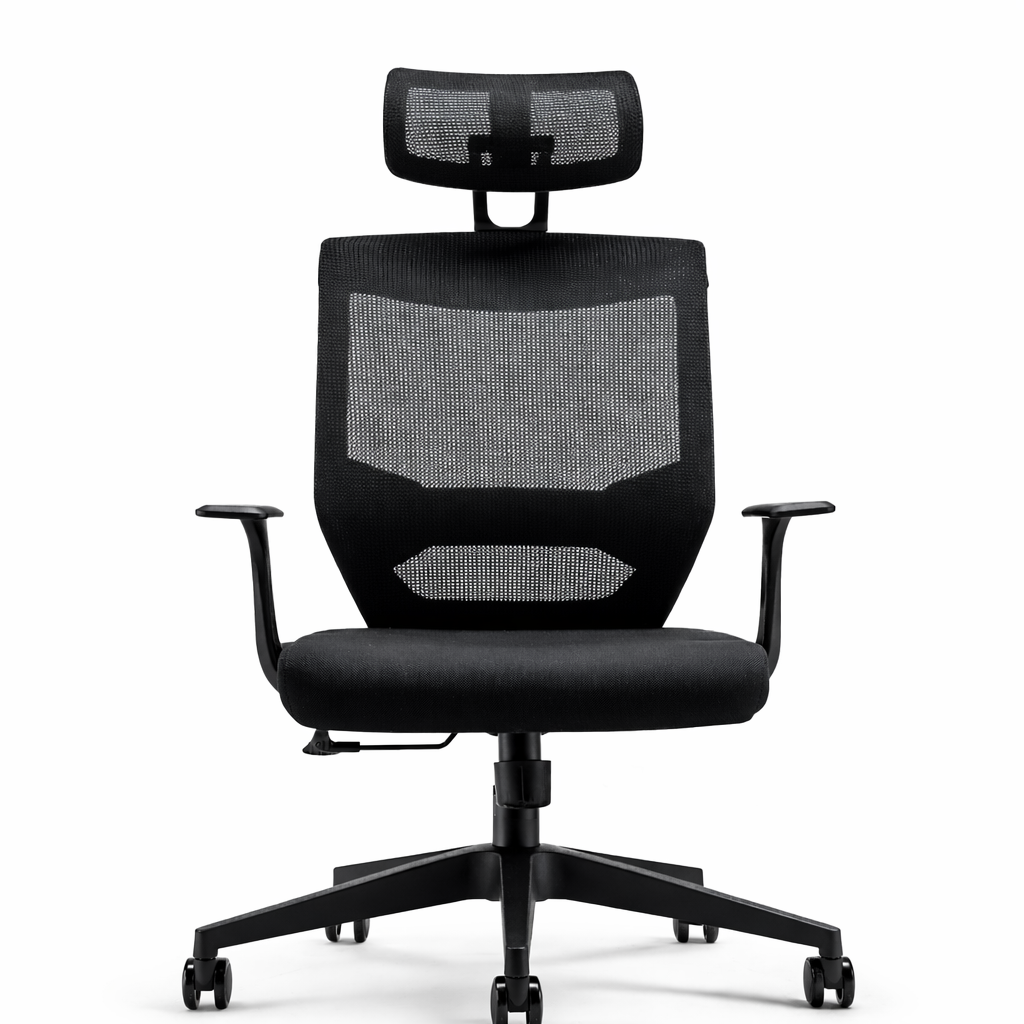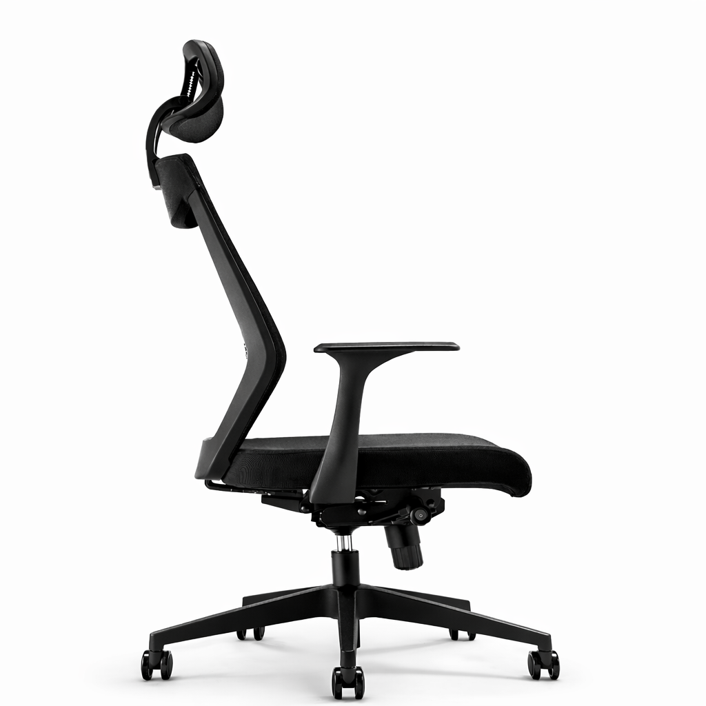 Cabezal móvil con regulación de altura y rotación, tapizado en malla para transpirabilidad. Respaldo de plástico con tapizado de malla para soporte y frescura. Asiento con estructura interna y tapizado en tela para estabilidad y comodidad. Mecanismo de asiento con inclinación en 4 posiciones y bloqueo. Apoyo lumbar regulable en altura y tensión de respaldo manual. Brazos regulables en altura, fabricados en poliuretano. Base de Nylon negro resistente con ruedas de poliuretano para un desplazamiento suave.