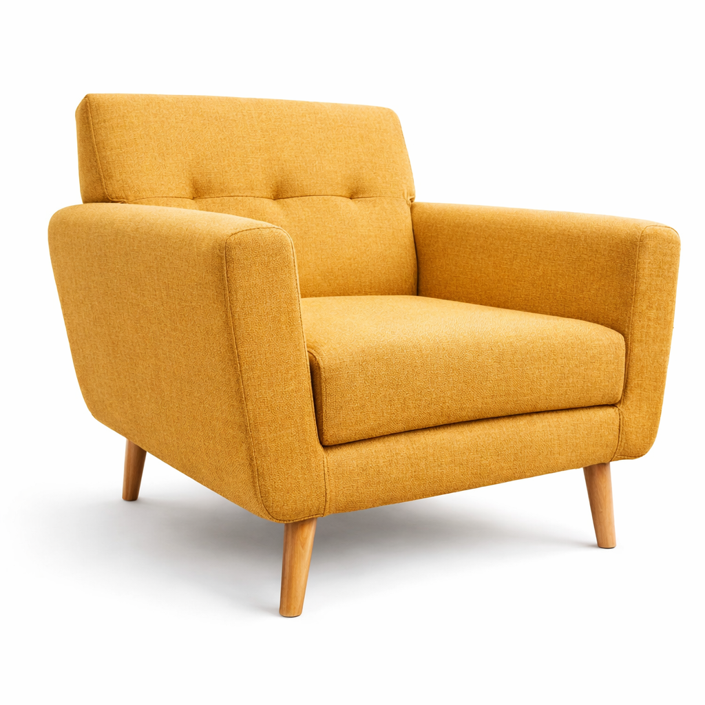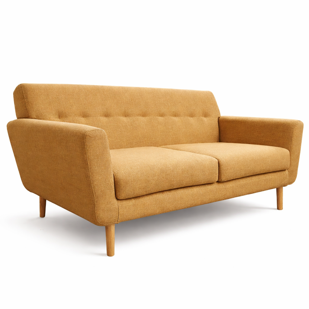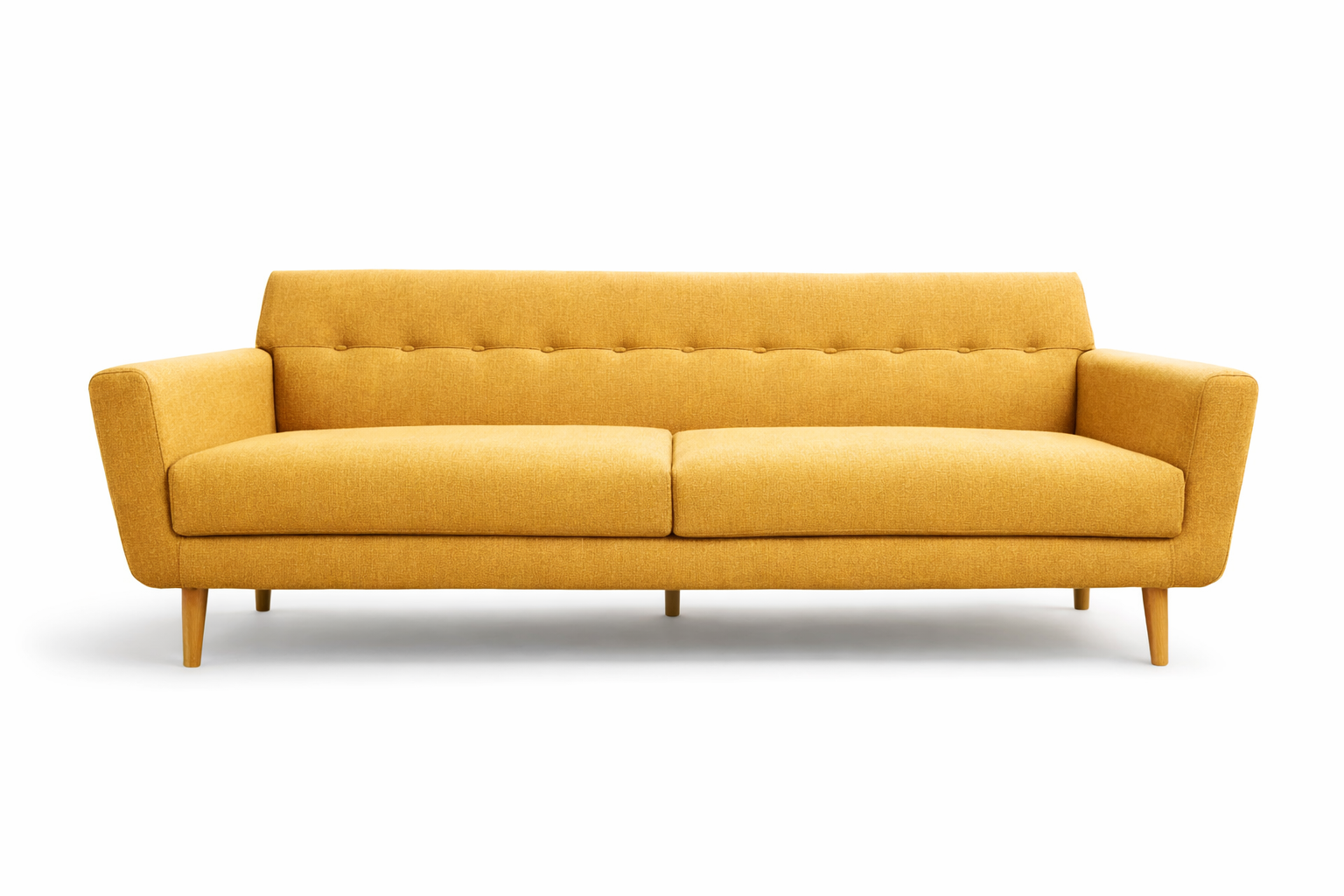 • Base compuesta por patas de madera torneada con terminación en barniz natural, que refuerzan el estilo retro del sofá, aportan calidez visual y aseguran una correcta elevación y estabilidad.