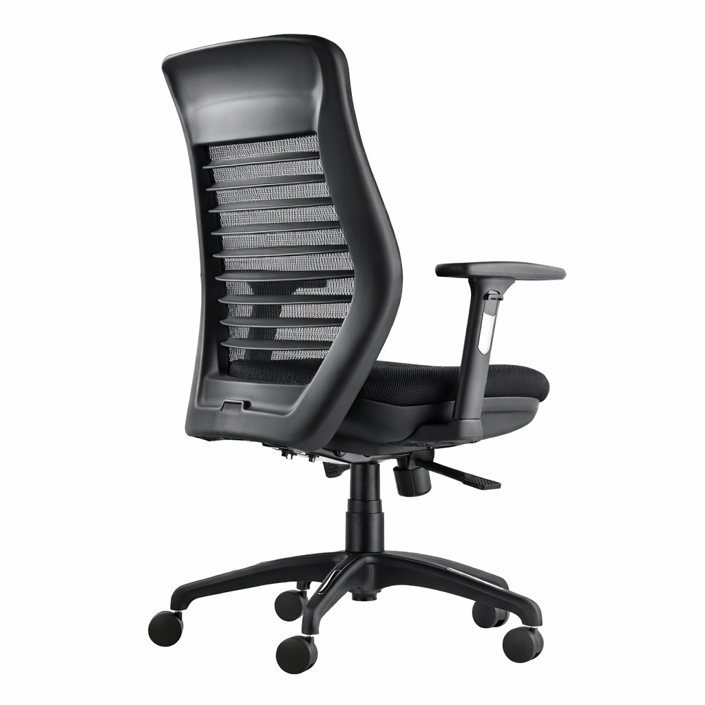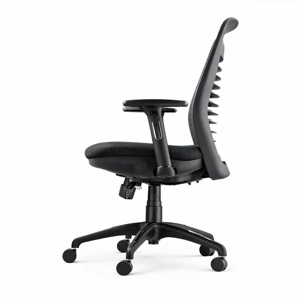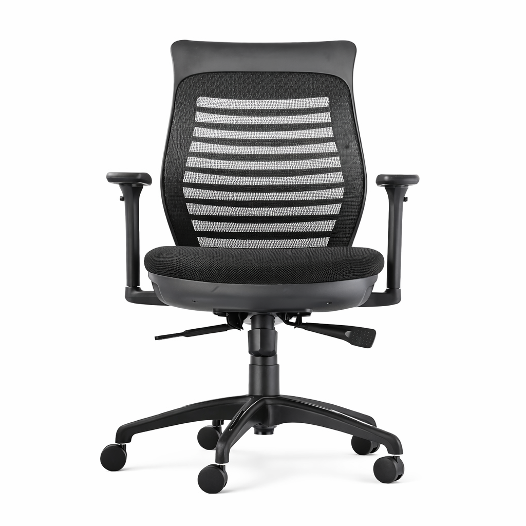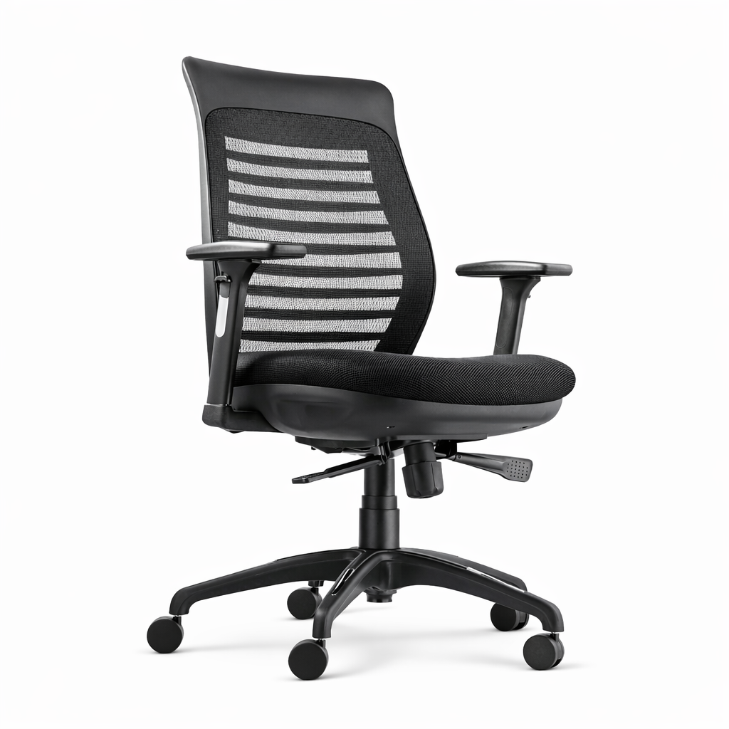 Su respaldo con bastidor plástico y tapizado en malla proporciona soporte estructural y transpirabilidad para una experiencia cómoda. El asiento, con estructura interna de plástico y tapizado en tela, brinda estabilidad y confort adicional. Con un mecanismo de inclinación en 3 posiciones con bloqueo, y apoyo lumbar fijo con mecanismo de tensión de respaldo manual, garantiza un ajuste personalizado. Los brazos ajustables en altura, de poliuretano, ofrecen comodidad y soporte para los brazos. Completa con una base de Nylon negro de 5 puntas y ruedas de nylon para un desplazamiento suave y silencioso.