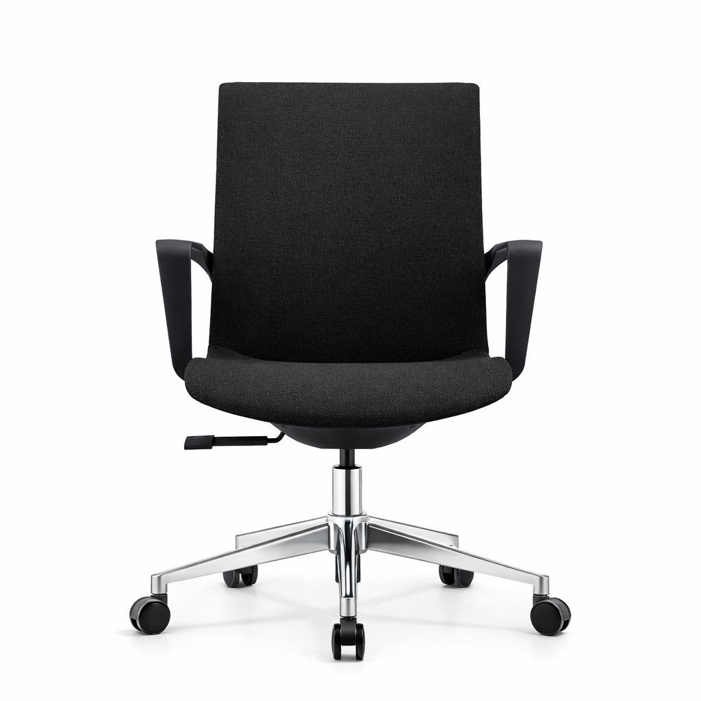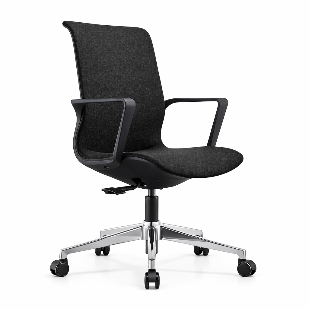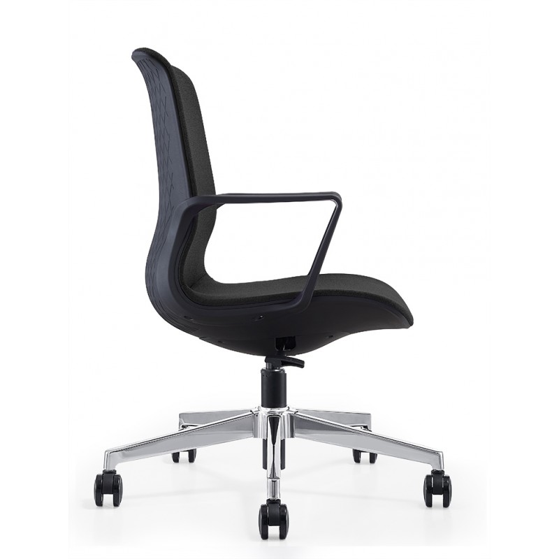 Con respaldo y asiento de plástico monocasco tapizado en tela negra, ofrece un diseño ergonómico que brinda soporte y confort para largas jornadas laborales. Su mecanismo de inclinación sin bloqueo y apoyo lumbar fijo aseguran una postura saludable y comodidad durante todo el día. Los brazos fijos de nylon proporcionan robustez y apoyo adicional. Además, su base de estrella de 5 puntas en acero cromado con ruedas de plástico combina durabilidad con movilidad, facilitando el desplazamiento en cualquier superficie.