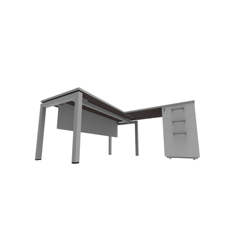 La estación de trabajo M8, con cubierta lateral y pedestal cajonera, está diseñada para entregar mayor superficie y capacidad de almacenamiento en un mismo mobiliario, manteniendo el estilo ejecutivo de líneas rectas y modernas.