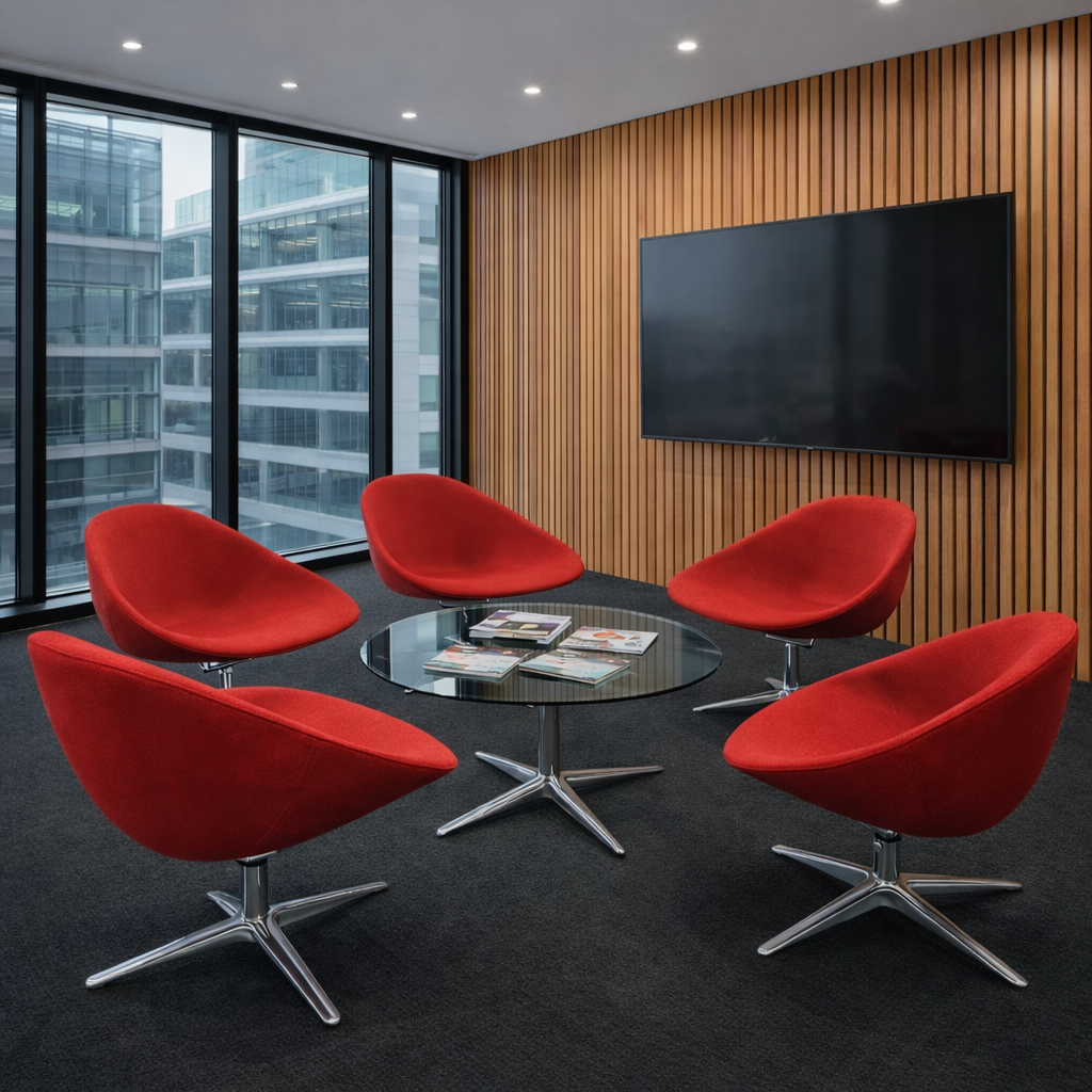 Esta butaca destaca por su silueta envolvente y su vibrante tapiz en tela roja, ideal para dar personalidad a salas de espera, cowork, recepciones o espacios colaborativos. Su estructura monocasco ofrece firmeza y confort en una sola pieza, mientras que su base cromada de 4 puntas aporta un toque moderno y sofisticado.