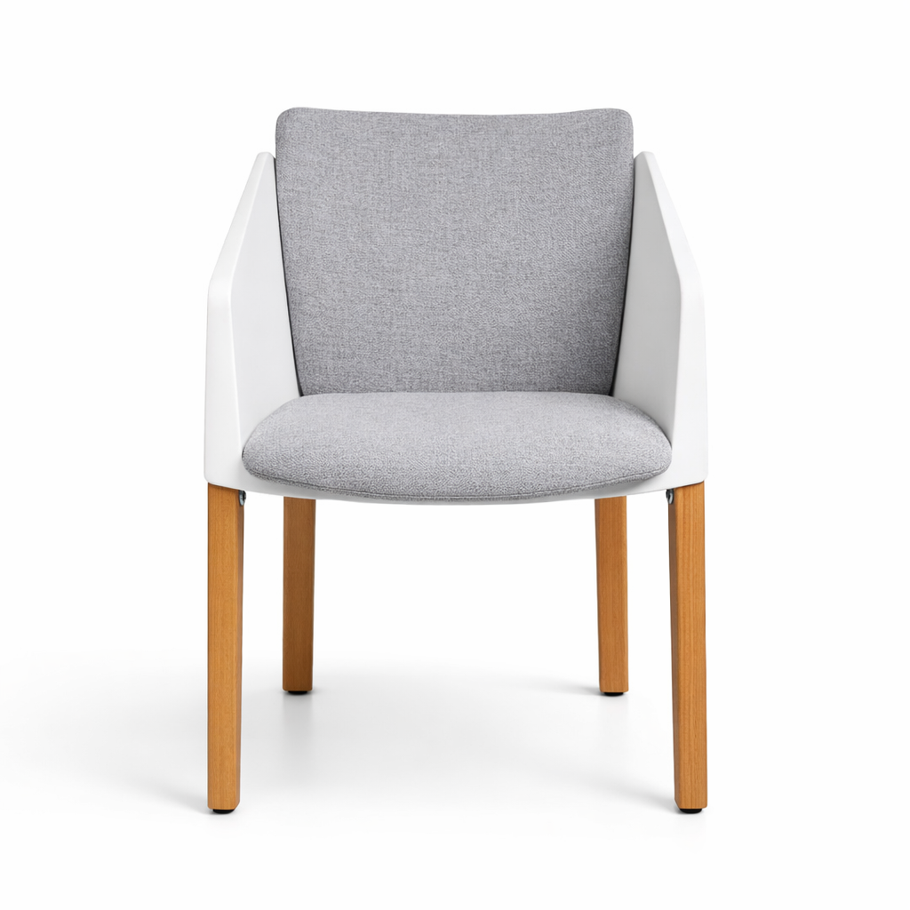 La Melissa es una butaca que combina elegancia y funcionalidad, perfecta para diversos entornos. Su respaldo y asiento monocasco de resina de polipropileno blanco, junto con un tapizado suave y resistente, brindan confort y estilo. Los brazos fijos ofrecen soporte adicional, mientras que las 4 patas de madera barnizada en tono oscuro y mate aportan una base estable y sofisticada.