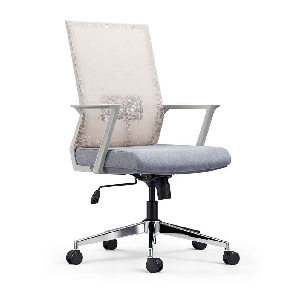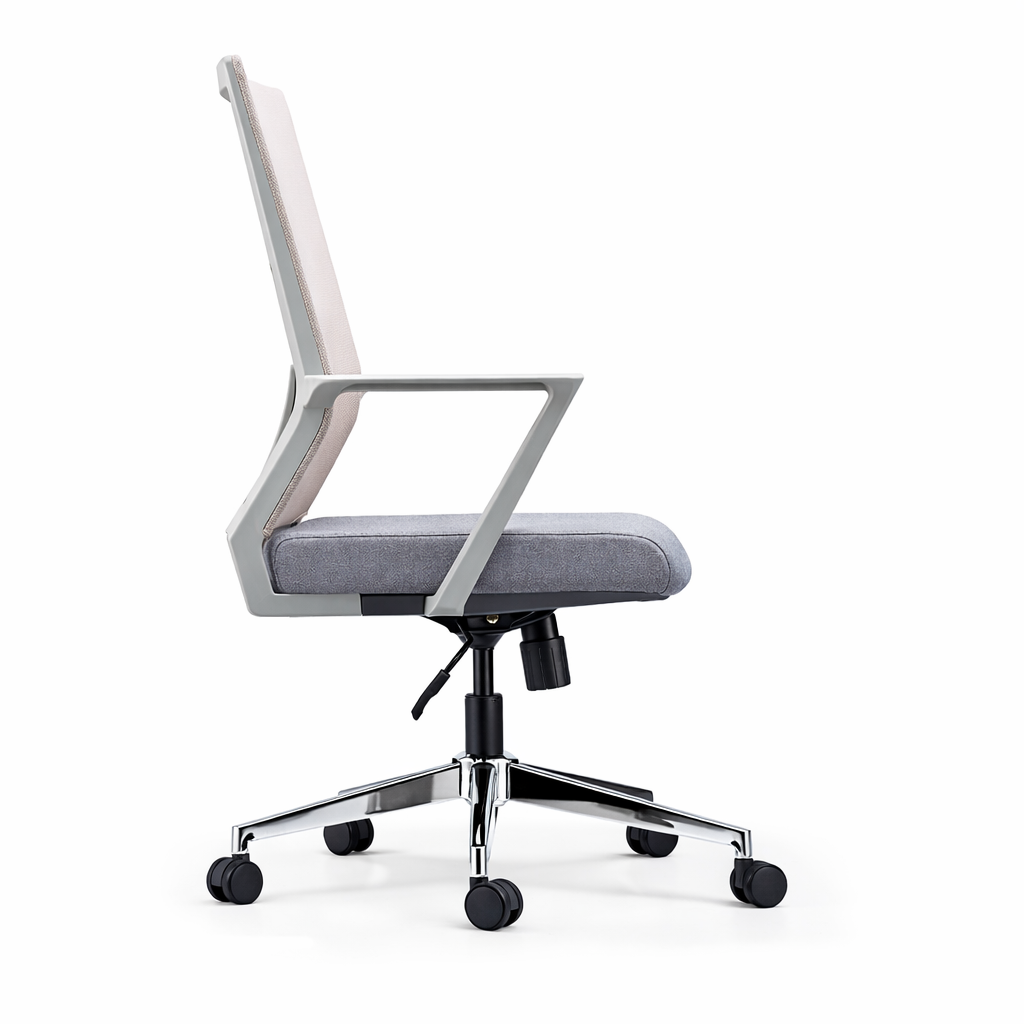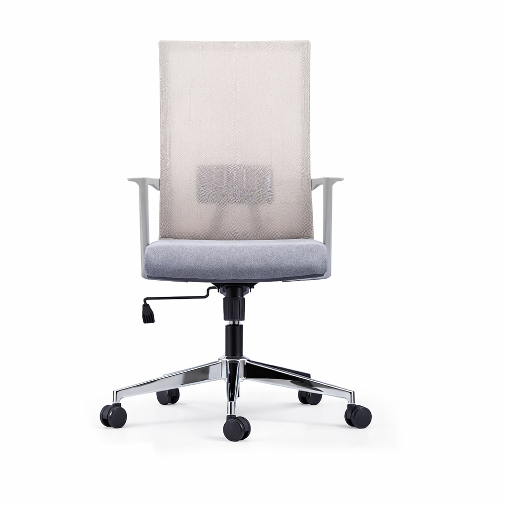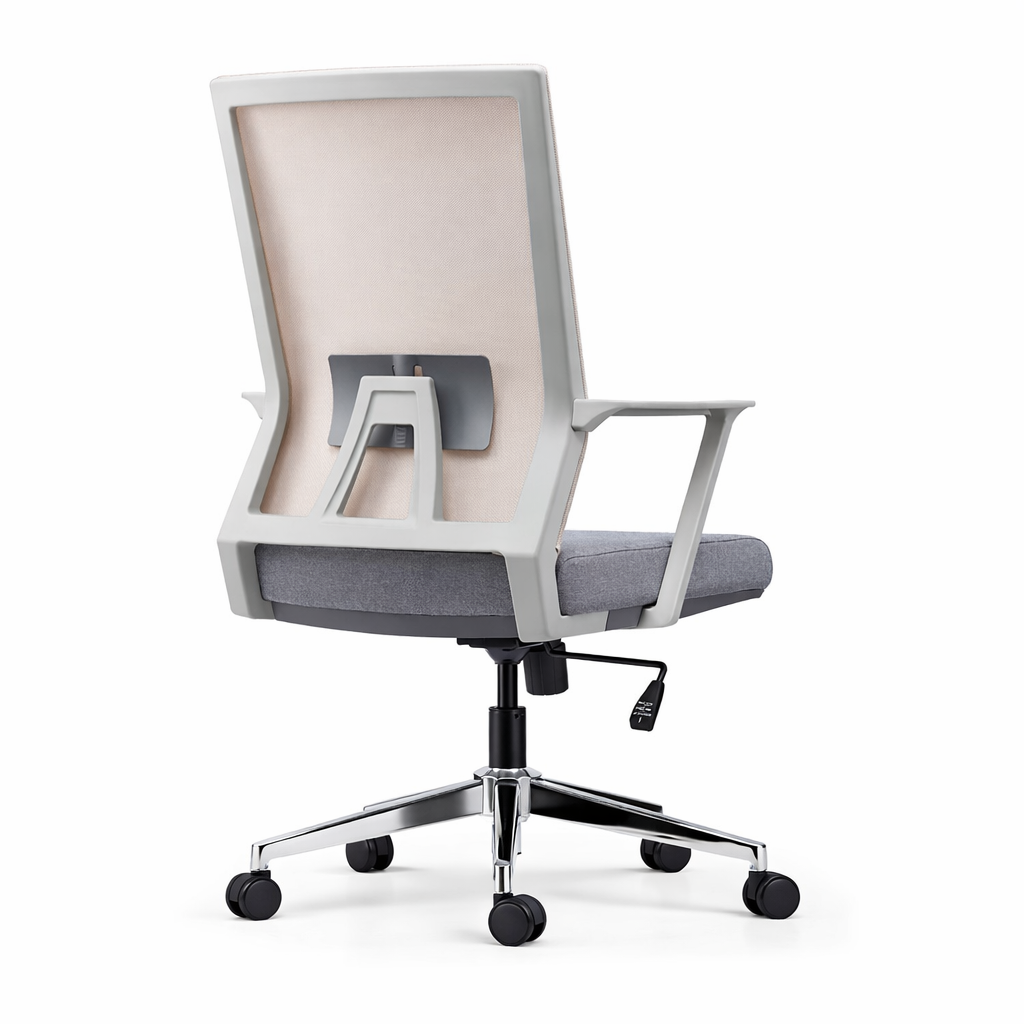 Su respaldo con bastidor plástico tapizado en malla ofrece un soporte estructural y una ventilación óptima, manteniendo al usuario fresco y cómodo todo el día. El asiento, con estructura interna de plástico y tapizado en tela gris, combina durabilidad con un toque de elegancia. Equipada con un mecanismo de inclinación simple sin bloqueo y apoyo lumbar regulable en altura, NEON GRAY BAJO promueve una postura dinámica y activa. Los brazos fijos de nylon proporcionan un soporte constante, mientras que la base de estrella de 5 puntas en acero cromado garantiza estabilidad y resistencia. Con ruedas de poliuretano para un desplazamiento suave y silencioso.