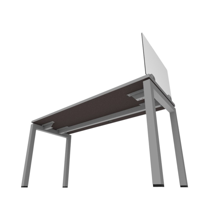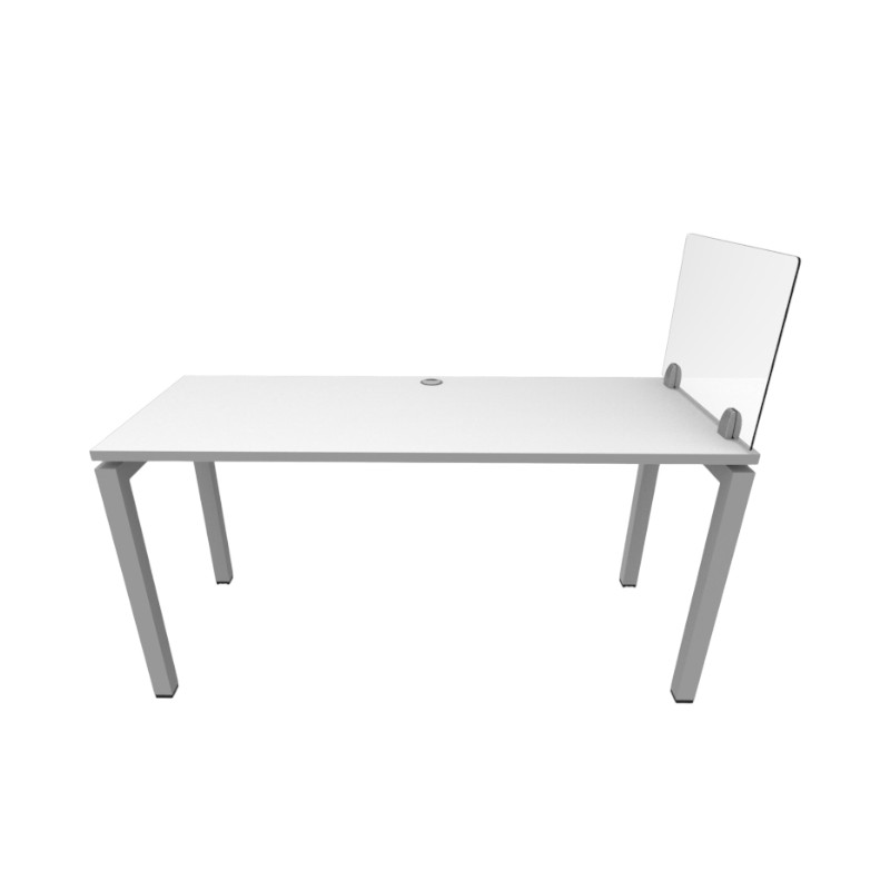 Perforacion pasa cable redonda sobre cubierta que permiten acceso eléctrico directo a muro. Para entregar privacidad y delimitación del puesto, incluye pantalla divisoria lateral de cristal templado, disponible en terminación transparente o empavonada.