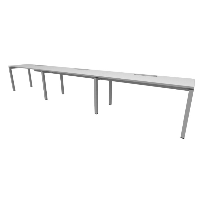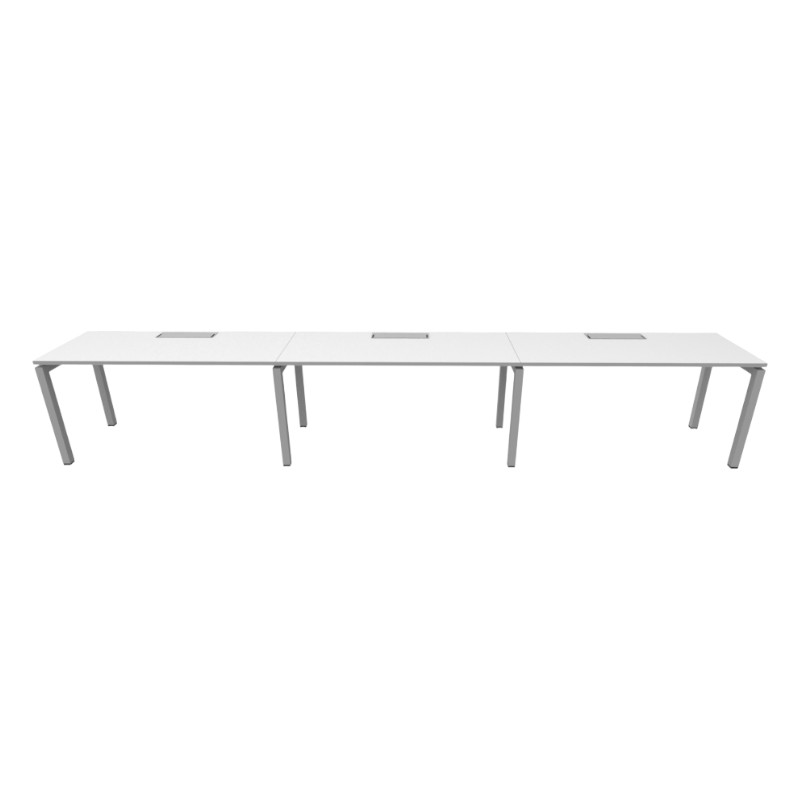 Estación de trabajo electrificable para 3 personas, diseñada para instalarse perimetralmente contra muro, ideal para oficinas con espacios reducidos que requieren orden, funcionalidad y eficiencia.