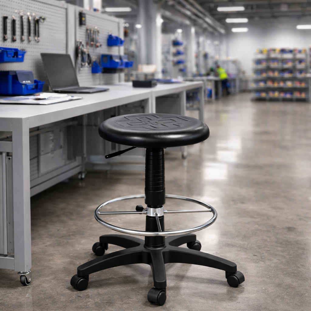 Su asiento de poliuretano negro combina resistencia, comodidad y fácil limpieza, ofreciendo una solución práctica y duradera para entornos profesionales.