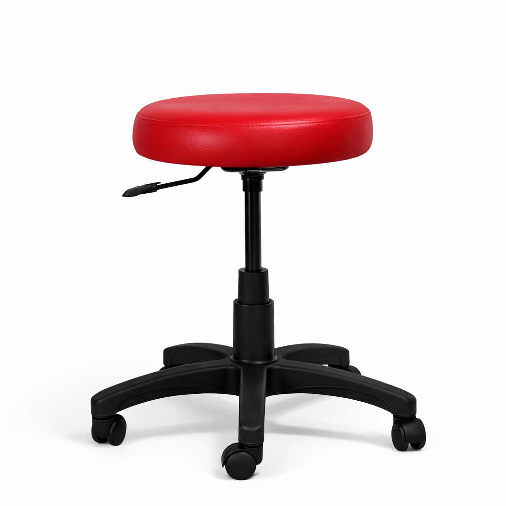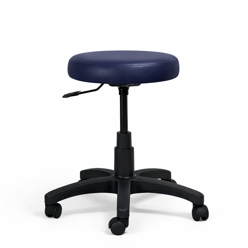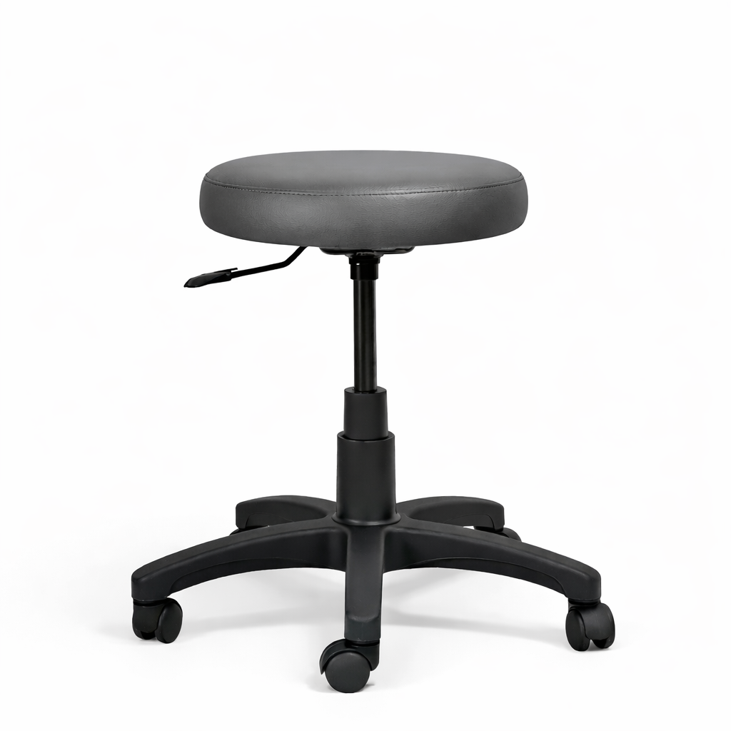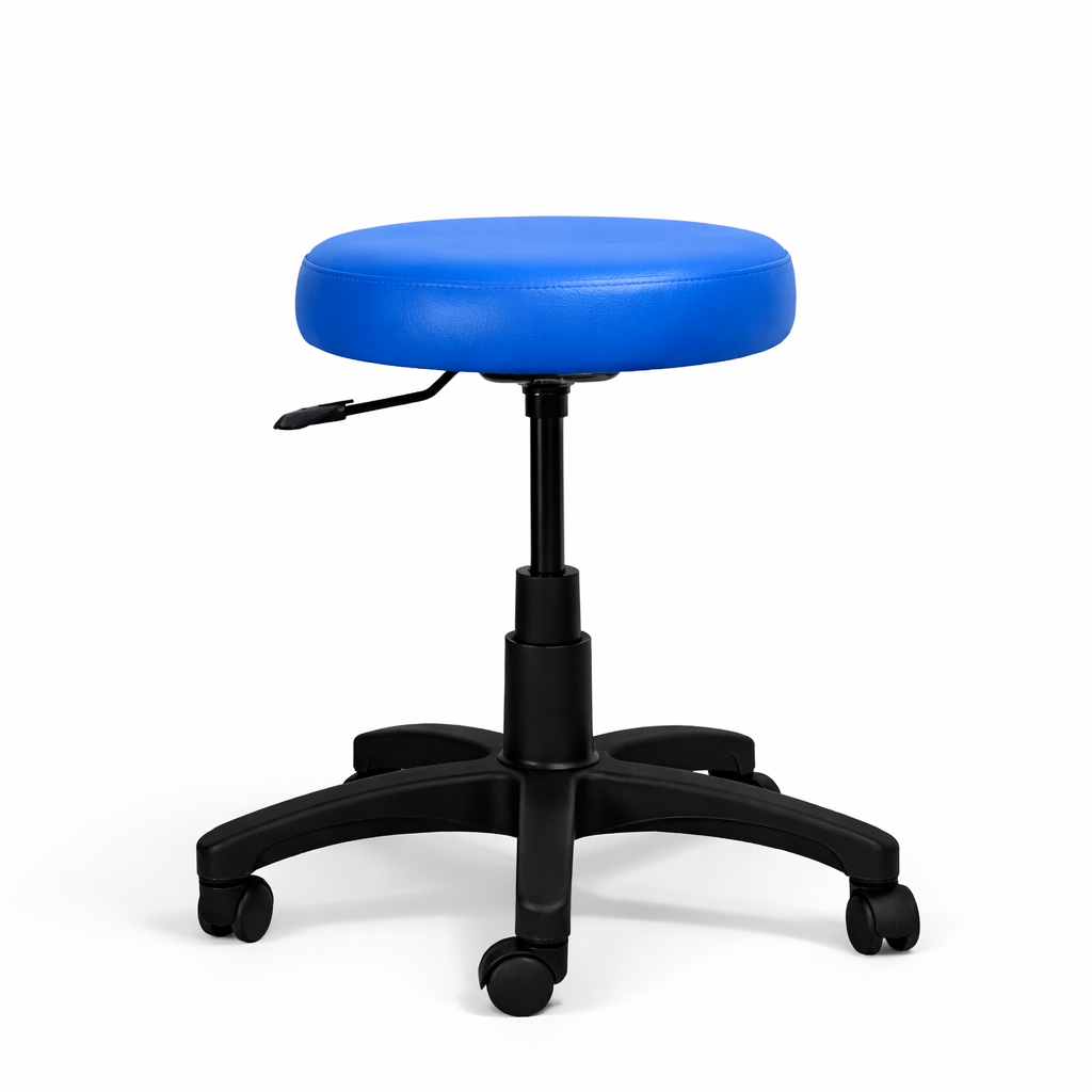 El asiento, con estructura de madera y opciones de tapizado en tela o vinilo, asegura estabilidad y resistencia, con una superficie fácil de mantener. Equipado con un mecanismo de altura ajustable, permite una personalización ergonómica para adaptarse a diversas situaciones. La base de nylon en forma de estrella de cinco puntas y ruedas del mismo material ofrece estabilidad, movilidad suave y silenciosa, ideal para desplazamientos frecuentes sin dañar el piso.