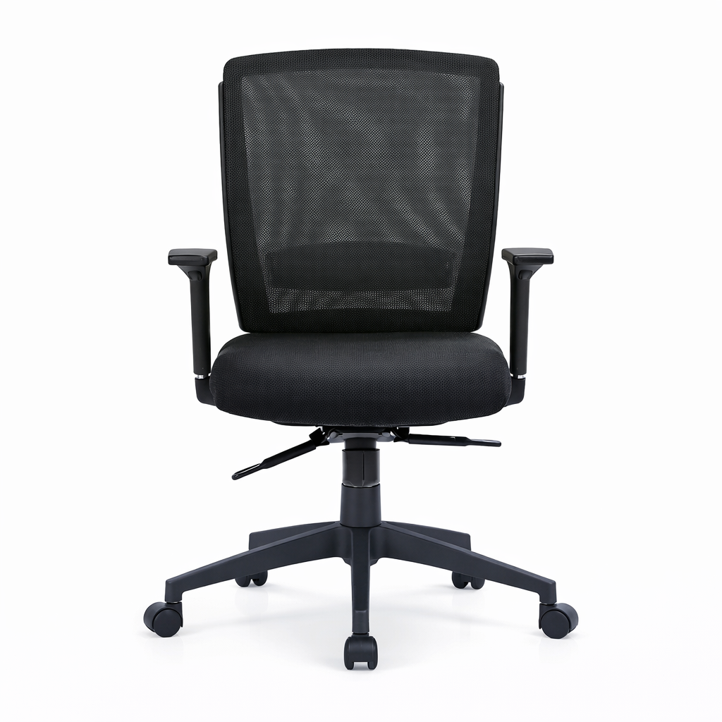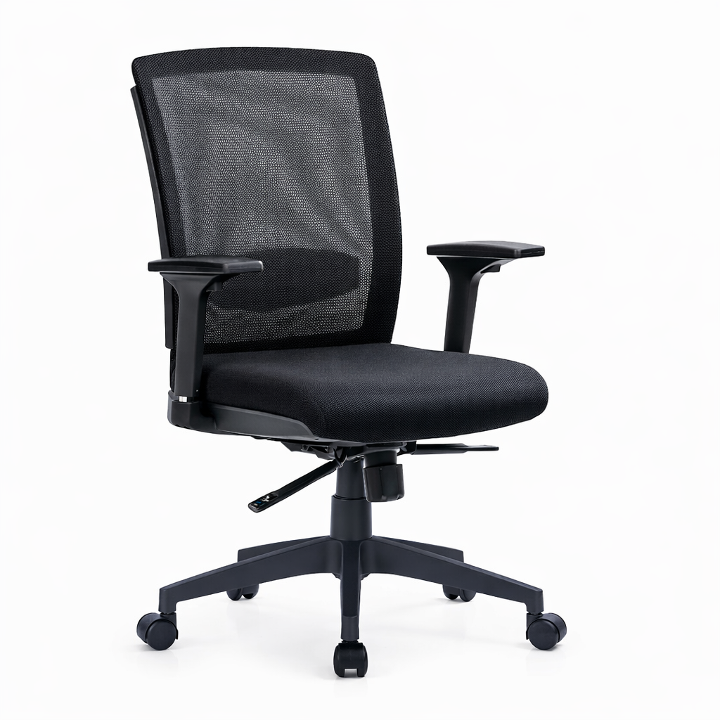 Su respaldo de construcción en plástico con tapiz de malla brinda un soporte firme y una ventilación óptima, asegurando tu comodidad durante horas. El asiento, con estructura interna de plástico y tapizado en tela, ofrece resistencia y confort para jornadas prolongadas. Equipada con un mecanismo Syncro, esta silla permite una inclinación coordinada del asiento y el respaldo, ajustándose automáticamente a tus movimientos para mantener un soporte constante. El apoyo lumbar regulable en altura y profundidad garantiza un soporte personalizado para tu espalda baja. Además, los brazos regulables en altura en poliuretano mejoran tu postura y comodidad. Con una base de estrella de 5 puntas de Nylon y ruedas que deslizan suavemente sobre cualquier superficie, la Venetto Bajo asegura estabilidad y movilidad.