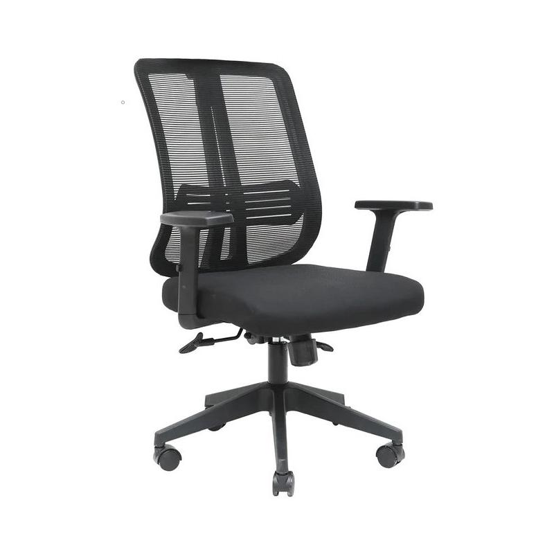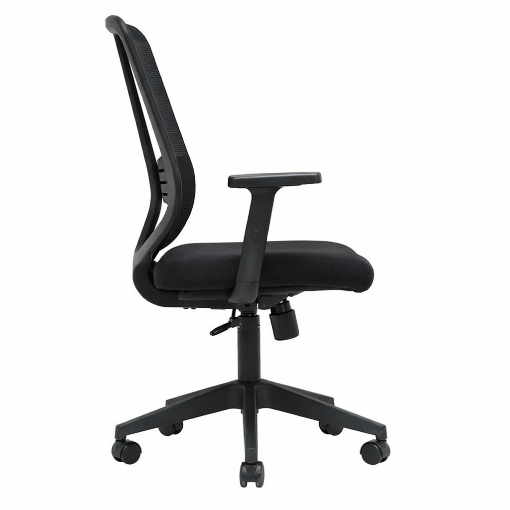 El asiento, con estructura interna de plástico y tapizado en lana negra, ofrece una superficie cómoda y térmicamente agradable, perfecta para largas horas de uso. Equipada con un mecanismo de asiento básico sin función de bloqueo, esta silla permite una movilidad constante, ideal para actividades que requieren cambios frecuentes de posición. Además, el apoyo lumbar fijo y el mecanismo de tensión de respaldo manual ofrecen un soporte personalizado para la zona lumbar. Los brazos regulables en altura, fabricados en poliuretano, brindan flexibilidad y contribuyen a una mejor ergonomía. Con una base de estrella de 5 puntas en plástico Nylon y ruedas de nylon, esta silla asegura estabilidad, durabilidad y un movimiento suave en diferentes tipos de superficies.